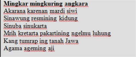 15. Mingkar mingkuring angkaraAkarana karenan mardi siwiSinawung resmining kidungSinuba sinukartaMrih kretarta pakartining ngelmu luhungKang tumrap ing tanah JawaAgama ageming ajiMingkar mingkuring angkara. Tembung angkara tegese ...